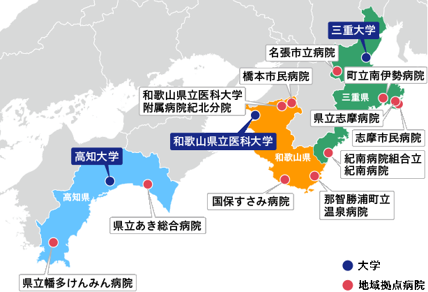 高知、和歌山、三重の3県において過疎地や遠隔地の地域医療を担う拠点病院が、大学と連携。実習やクリニカルクラークシップの受け入れ先として、また地域枠卒業医師の義務年限の勤務先として、実践的学びやキャリア形成を支えます。